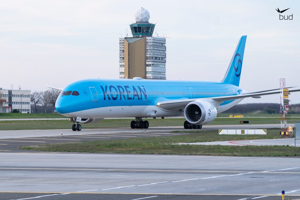 Egy Boeing a Liszt Ferenc Nemzetközi Repülőtéren. Mögötte az irányítótorony. Fotó: Budapest Airport